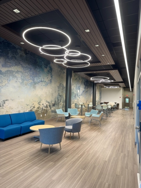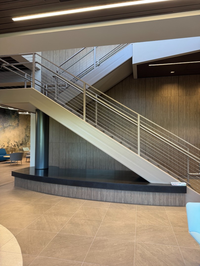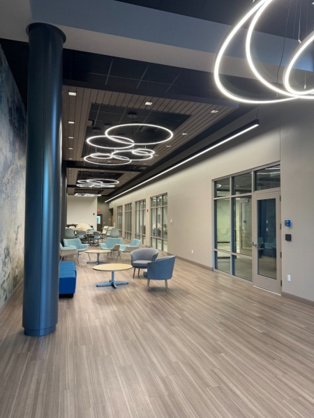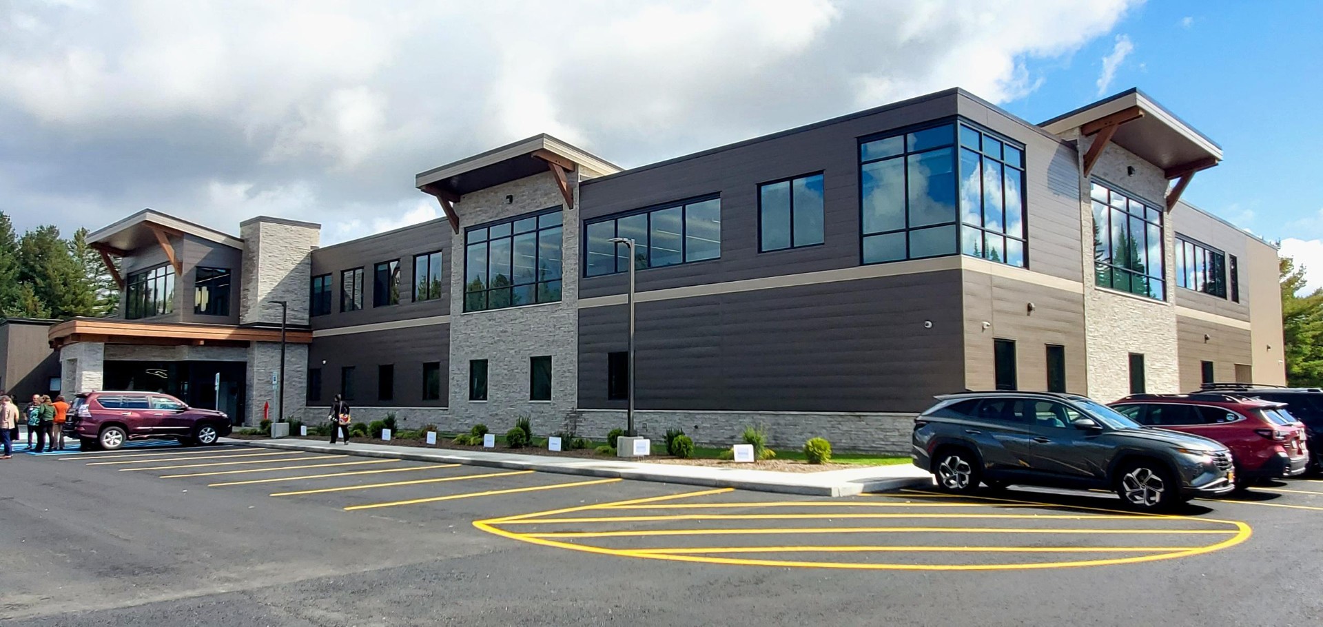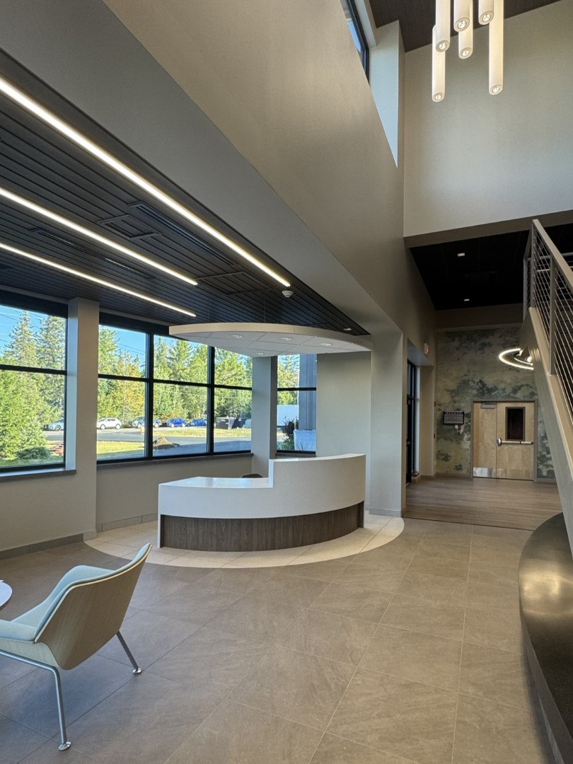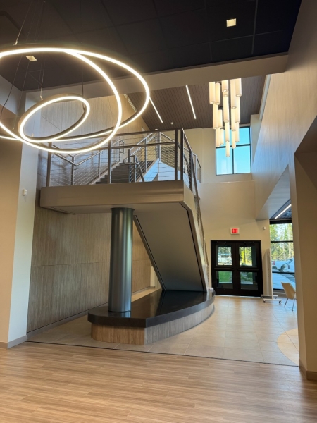 The design promotes both scientific precision and workplace connection. A central gallery links the addition to the existing building, offering staff a collaborative hub and visitors a view into the active lab environments. On the second floor, new offices and meeting spaces accommodate growth and streamline operations. Exterior materials—stone and timber—reflect the surrounding Adirondack landscape, grounding this advanced facility in its regional context while positioning it for continued innovation in biosafety and drug development.
